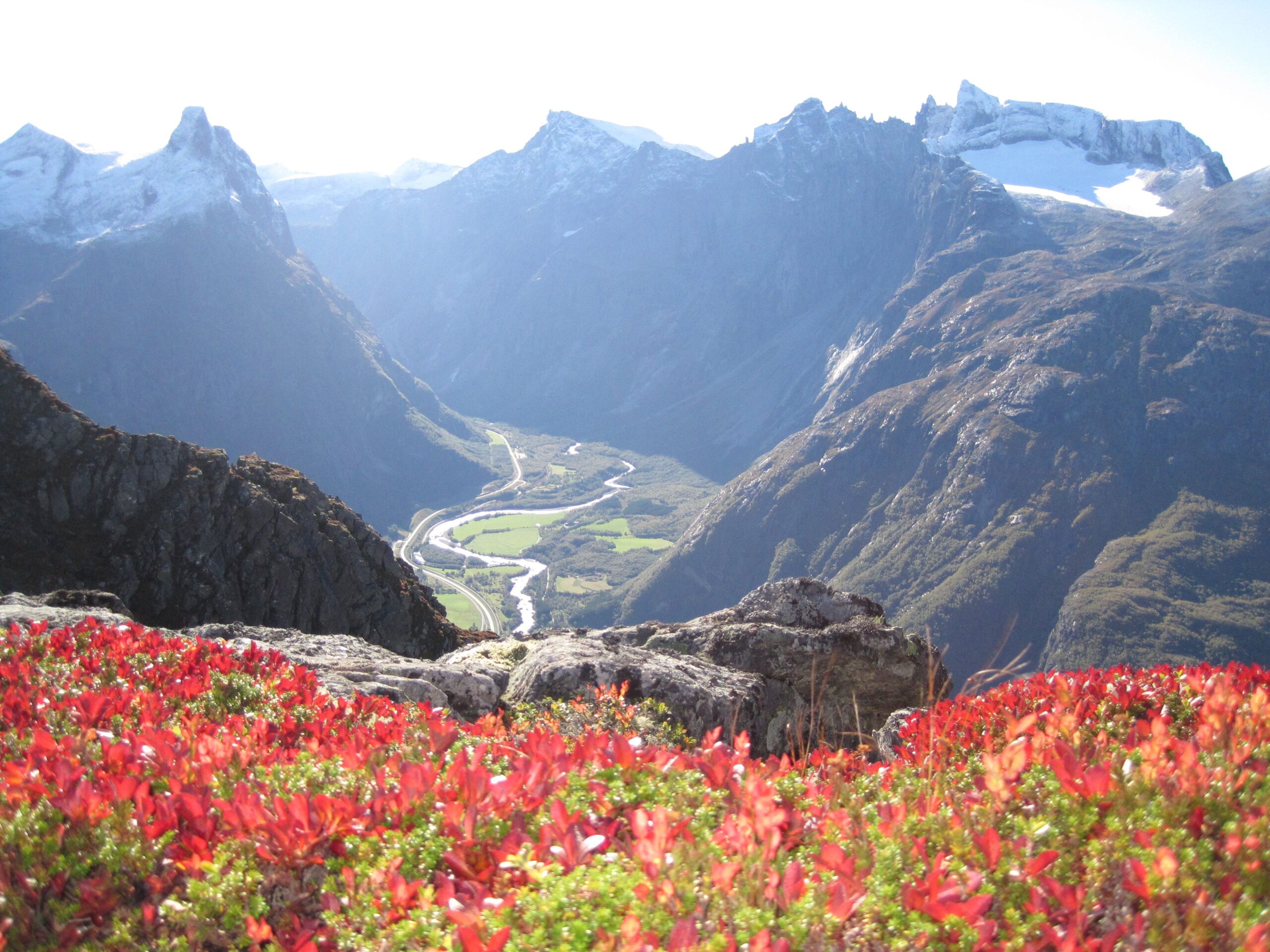 Von Romsdalseggen aus blicken Sie hinauf über Romsdalen in Richtung Trolltindene und Romsdalshorn