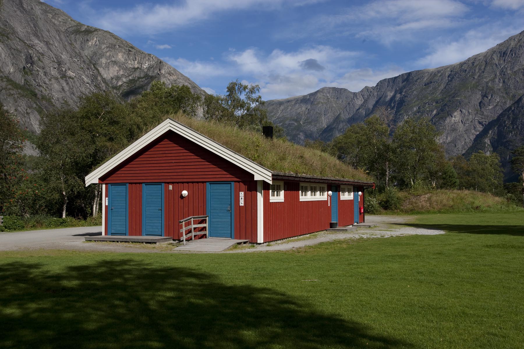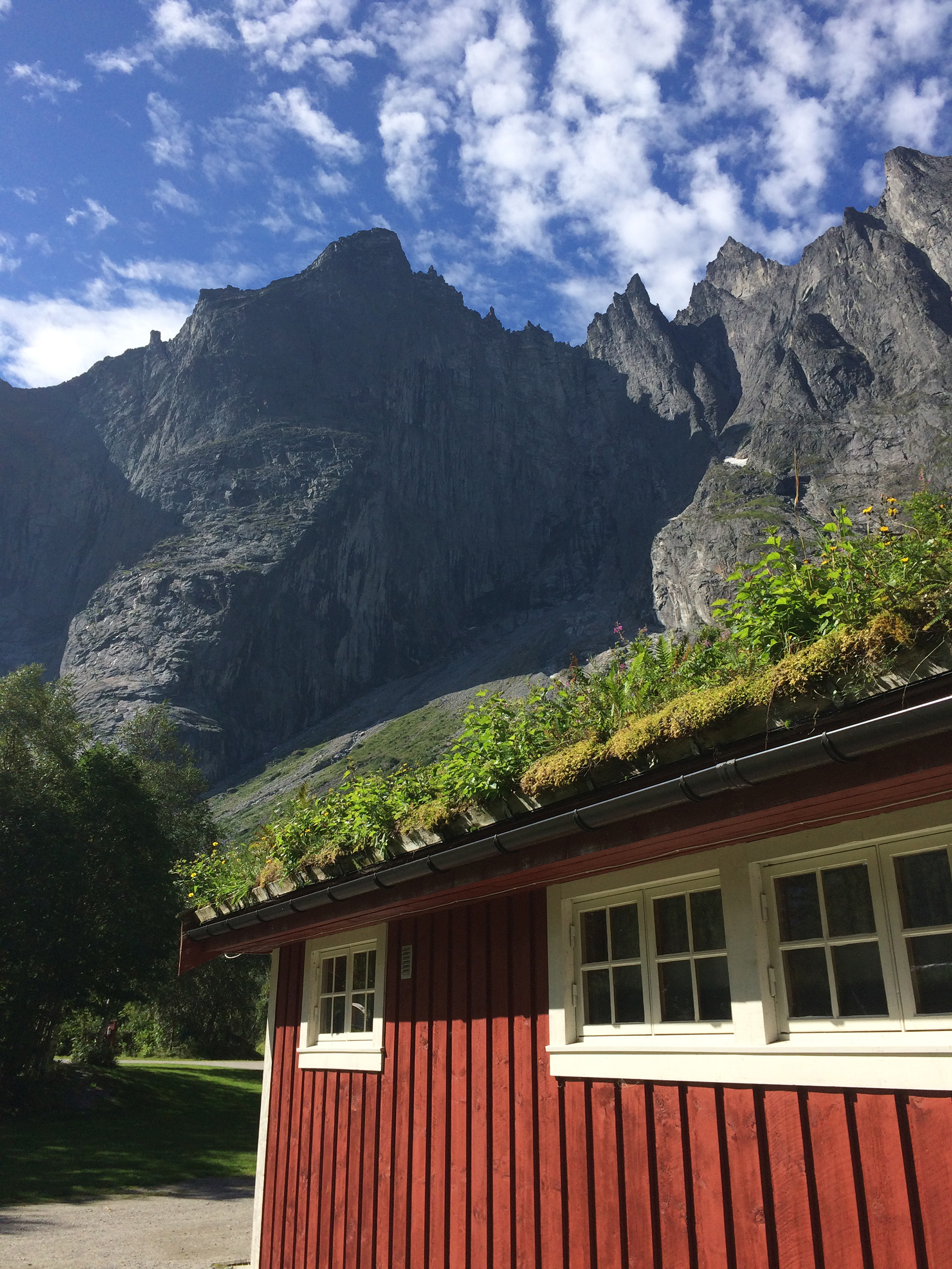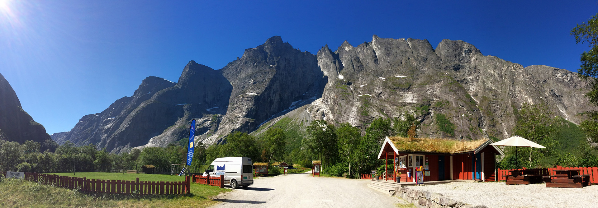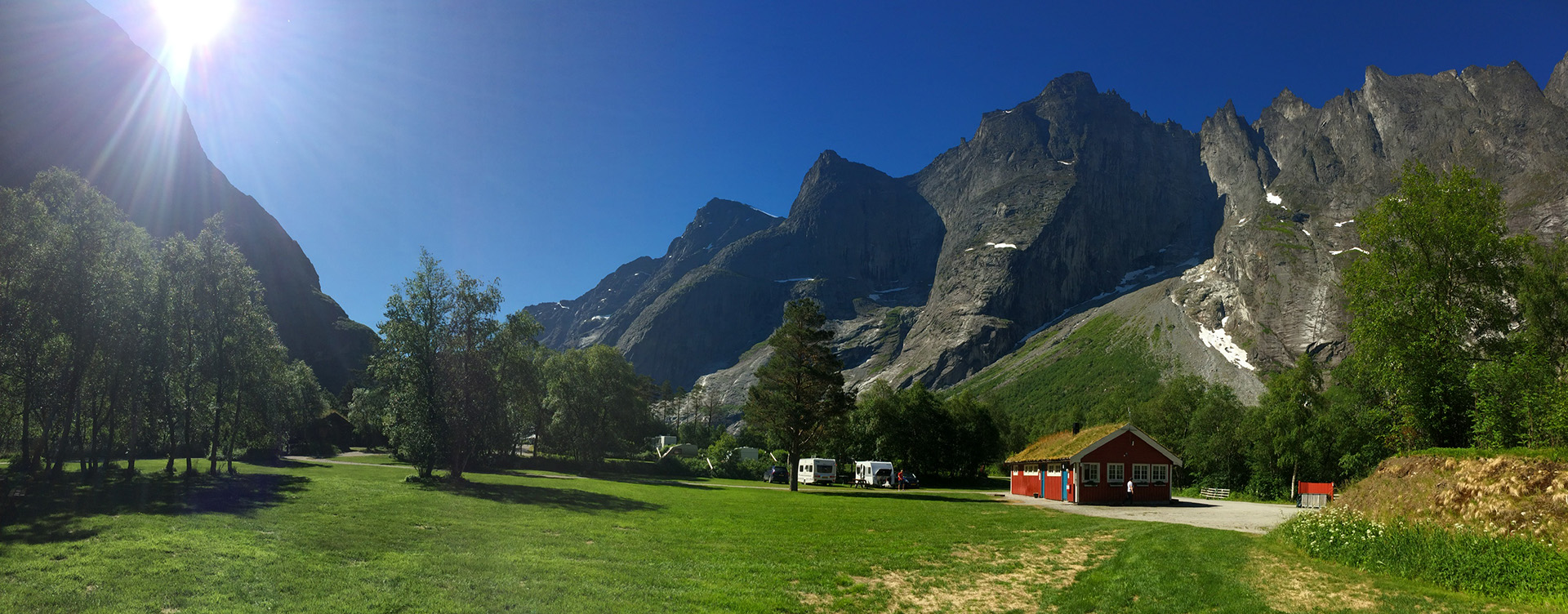 Tolle Aussicht auf den Trollveggen. Das rote Gebäude ist die Sanitäranlage auf dem Campingplatz