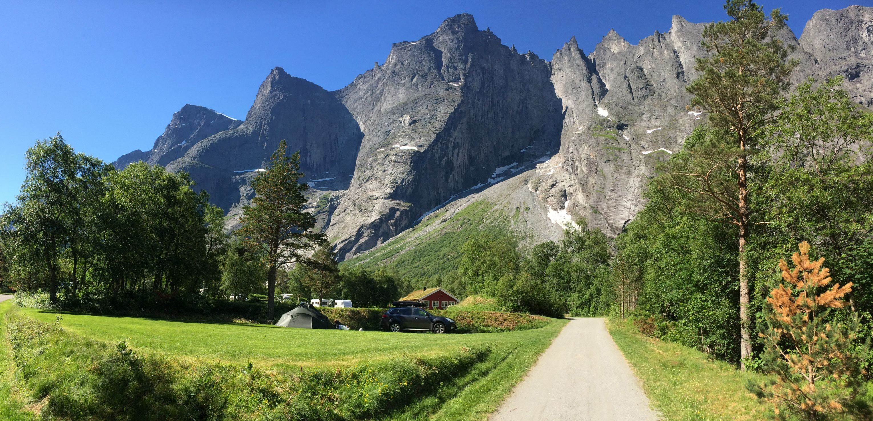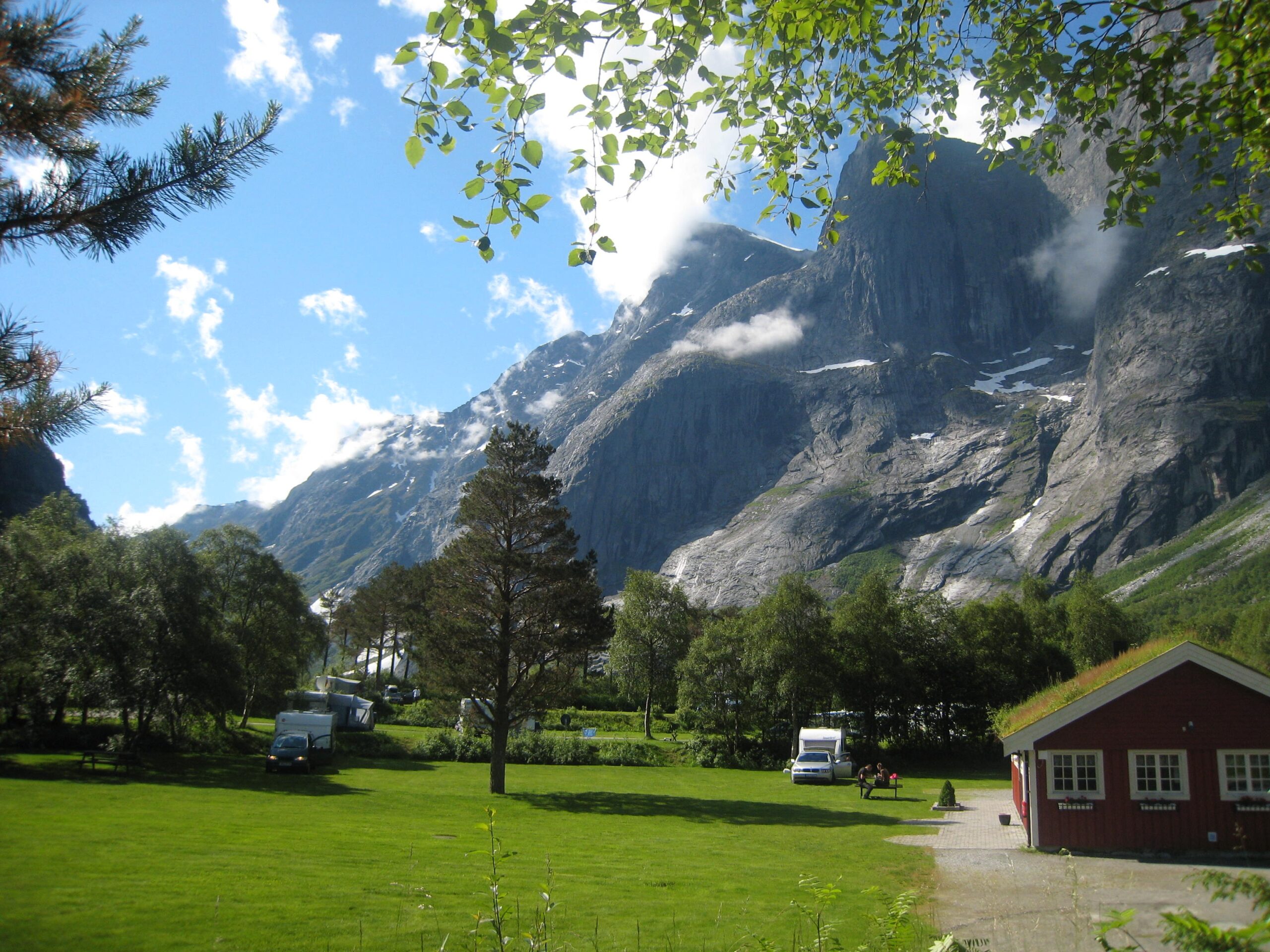 Magnificent view of Trollveggen. The red building is the sanitary facilities at the campsite.